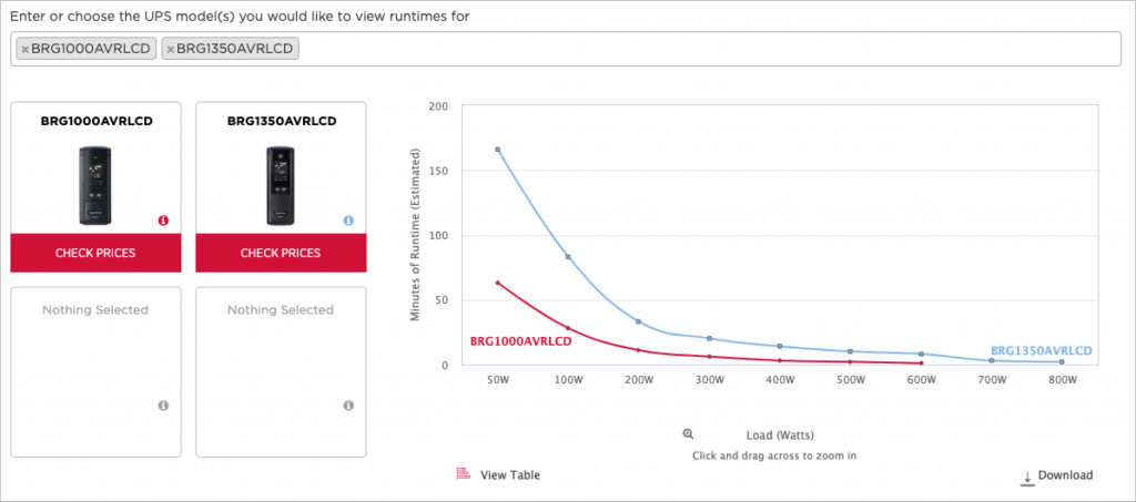 They’ll probably recommend a UPS with a higher capacity than is necessary—they are trying to upsell you, and the calculations will be based on the maximum loads you entered. If your Mac is running flat out, you’re likely sitting there and can shut it down quickly, so a long runtime isn’t necessary. If you’re not at the Mac, it should be sleeping, leading to a much longer runtime. CyberPower provides a nice runtime calculator that lets you see how long different models will last based on the actual load.