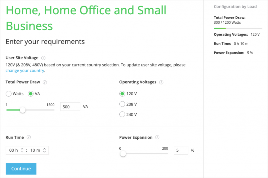 As you would expect, standby models are the cheapest, and double conversion models are the most expensive. How big of a UPS do I need?You’ll need to do some research and math to determine the capacity of your ideal UPS. The first step is to find the size of the load you’re going to connect to it. To do that, look on the back of devices or in their technical specs for a rating in watts (W) or volt-amps (VA). Theoretically, the two are equivalent—watts equals volts multiplied by amps. In reality, you also have to take into account something called power factor along with runtime—how long you want the UPS to power your system before its battery dies. Apple publishes power consumption numbers for most recent models of the Mac mini, iMac, iMac Pro, and Mac Pro. For the MacBook, MacBook Air, and MacBook Pro, look at tech specs to find the wattage rating of the charger, which will be between 30W and 96W. Then add in any peripherals you’re planning to plug into the UPS, such as an external hard drive, Wi-Fi router, and the like. You may need to read the tiny print on power adapters and multiply volts by amps to get the wattage rating. For instance, for a system comprising a 27-inch iMac from 2019, a 27-inch Thunderbolt Display, and an external hard drive, you’d add up the following numbers: That gives you a total of 402W maximum, although it’s likely to be lower in normal usage. Nonetheless, to convert watts to volt-amps and account for the power factor, we divide the maximum wattage rating by power factor—a safe power factor is 0.8. So 402W / 0.8 = 503VA. So at a bare minimum, you’d want a UPS rated for 500VA. For some wiggle room on adding devices, it’s worth increasing the capacity by 50–100%, bringing us up to 750VA to 1000VA. Here’s where things get fuzzy. The next step is to take that number and plug it into a UPS selector. Major manufacturers like APC (shown below), CyberPower, and Tripp Lite provide tools along these lines.