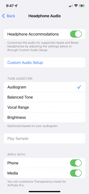 Once you set the custom audio for your headphones you can choose to apply them to the phone and/or media and activate Transparency Mode.