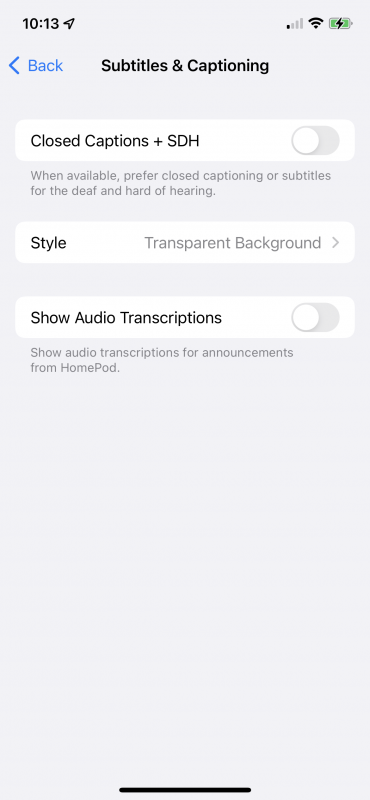 The last section will allow you to toggle Closed Captions and SDH (subtitles for the deaf and hard of hearing). You can choose a background for the screen, toggle large text or even create your own custom style.