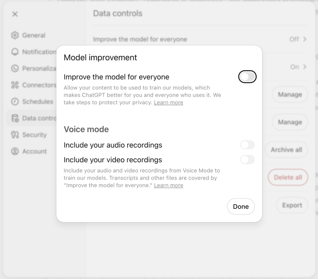 - ChatGPT: Go to Settings > Data Controls and turn off “Improve the model for everyone.”